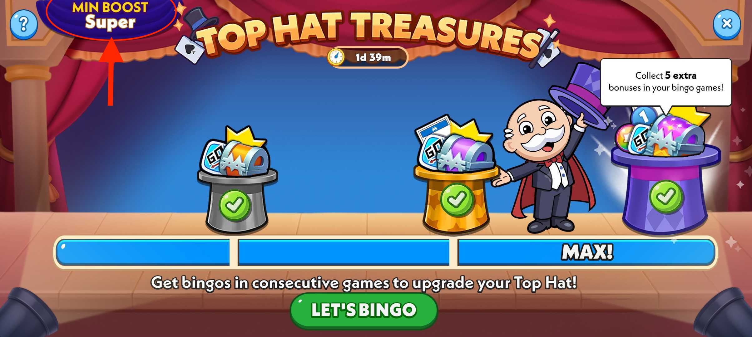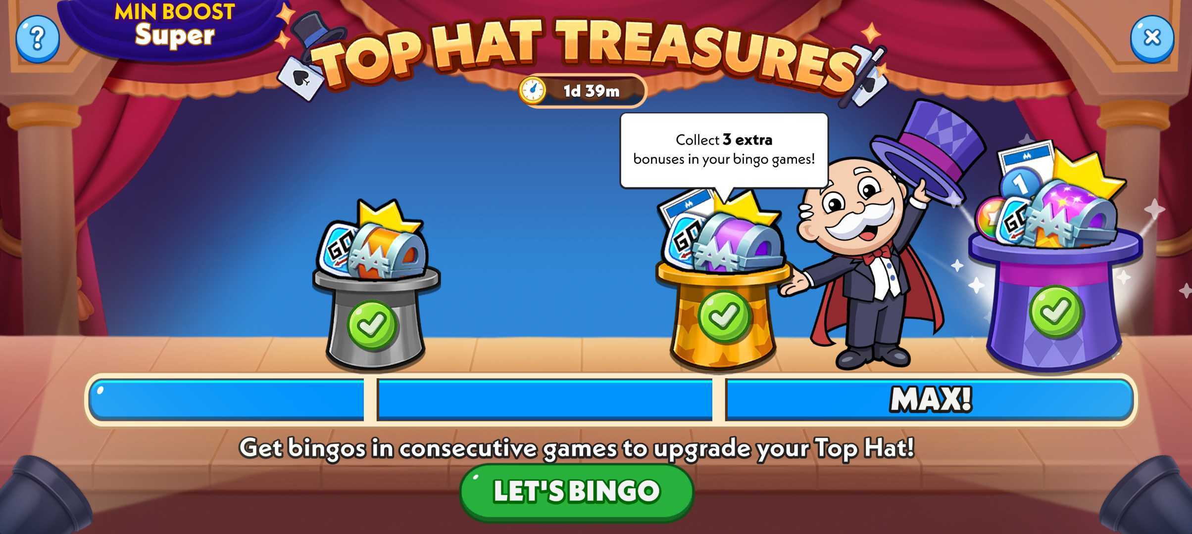 Top Hat has 3 streak rewards that you earn by getting consecutive Bingos. Keep your streak going to reach the maximum rewards after each game.